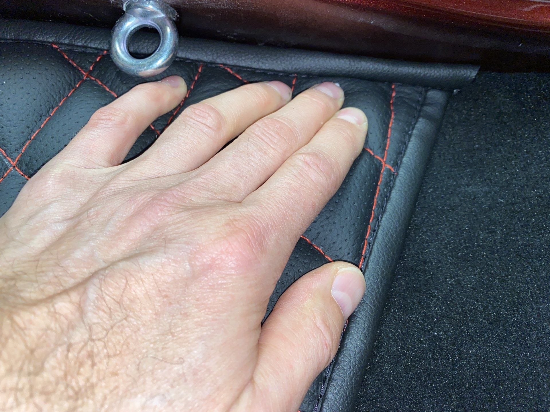 mark the edges where the leather back will fit, make a template for both sides ensuring you make it large so the carpet is larger and overlaps where the back fits..