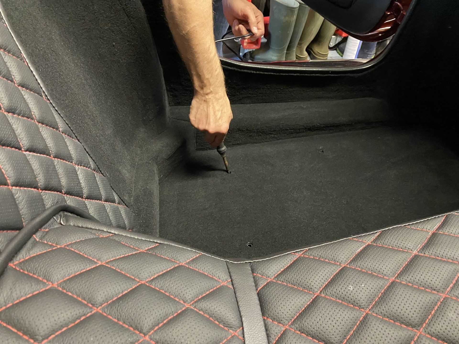 use an old soldering iron to make the holes in the carpet. nice sealed edges.